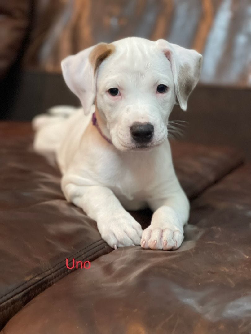 This is Uno, one of Mama Darla's “Game Litter” pups from Sunshine Big Dog Rescue, and he’s ready to meet potential adopters. He and his littermates were born 7/26/23. Mama Darla appears to be a bulldog/Staffy mix, and we suspect the pups are more bulldog genetics. They are all fostered in a home with other dogs, kids, and fun. Each pup will be spayed/neutered, up to date on age appropriate vaccinations, microchipped, and dewormed. Adopters must have a securely fenced yard due to their vaccination schedule. The rescue requires someone home often, or a scheduled dog sitter/walker for feeding/potty schedules. To meet this adorable pup, please visit our website for further requirements and to submit an application for adoption. SunshineBigDogRescue.com